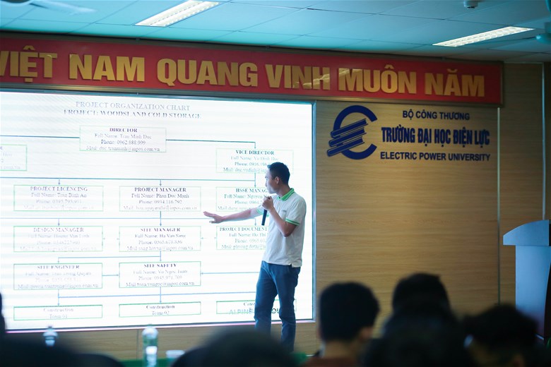 Tại buổi đào tạo, diễn giả cùng sinh viên tìm hiểu về Các vị trí cho một dự án Điện mặt trời với vai trò tổng thầu. Các vị trí bao gồm: Quản lý dự án, Kỹ sư thiết kế chính, Chỉ huy trưởng; dưới Chỉ huy trường gồm Giám sát thi công, Giám sát an toàn, Vận hành bảo trì…