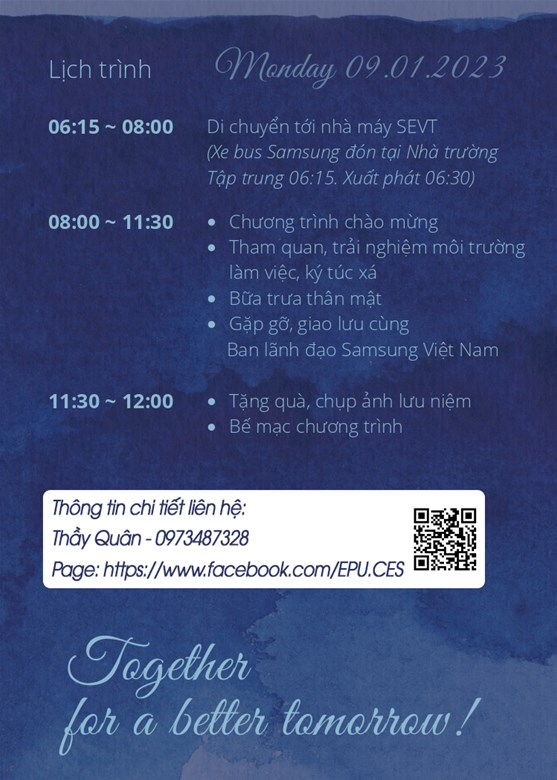 Bước sang năm 2023 với rất nhiều kế hoạch và chương trình bổ ích dành cho sinh viên EPU, Công ty Samsung Electronics Việt Nam Thái Nguyên phối hợp cùng trường Đại học Điện lực – đầu mối Trung tâm Hỗ trợ việc làm và khởi nghiệp tổ chức chương trình “Samsung – Hành trình đến tương lai” vào thứ hai ngày 09/1/2023 tại nhà máy Samsung Electronics Việt Nam Thái Nguyên (SEVT, KCN Yên Bình, Đồng Tiến, Phổ Yên, Thái Nguyên).