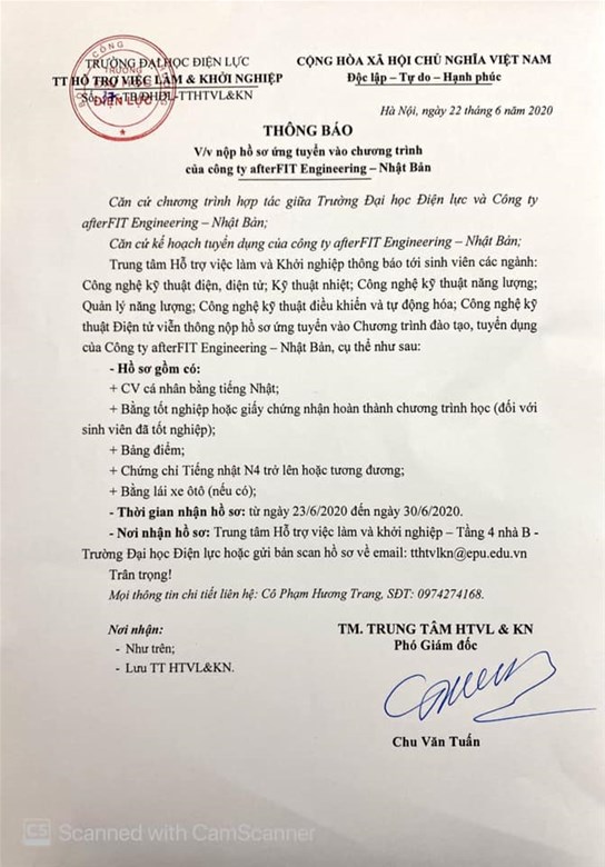 THÔNG BÁO V/V NỘP HỒ SƠ ỨNG TUYỂN VÀO CHƯƠNG TRÌNH ĐÀO TẠO TUYỂN DỤNG CỦA CÔNG TY AFTERFIT ENGINEERING- NHẬT BẢN